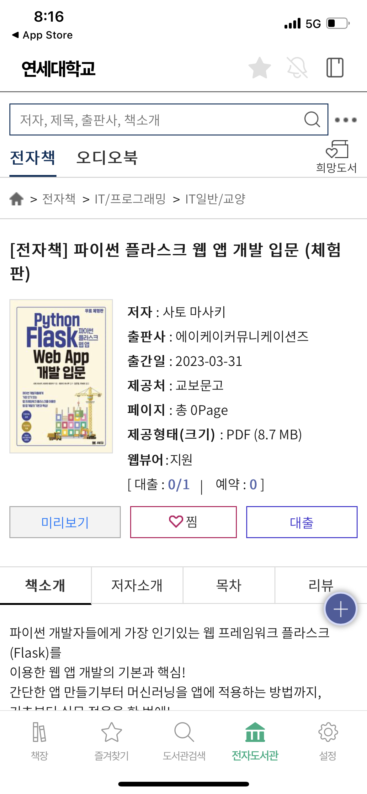 로그인까지 마쳤다면, 이제 실제 도서관처럼 책을 대출할 수도 있고, 이미 대출이 되어 있는 책은 예약도 가능하다.