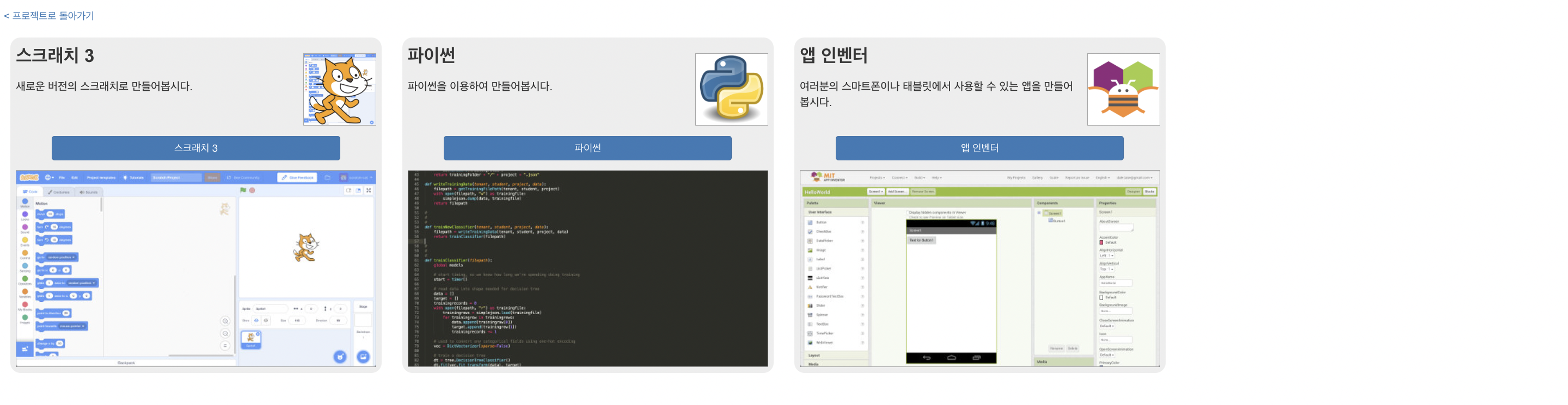 이제 이 구축된 모델을 이용하여 챗봇을 만들어볼 것이다. 프로젝트로 돌아가서 만들기를 누르면 다음과 같은 화면이 나온다. 보다시피 스크래치나 파이썬, 앱 인벤터로 간단하게 챗봇을 만들 수 있다. 여기서는 파이썬을 이용해 볼 것이다.
