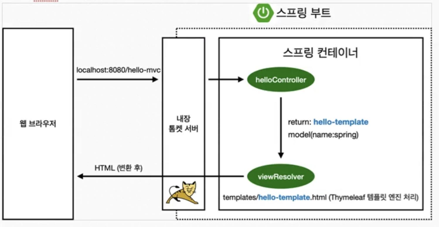 - 웹 브라우저에서 localhost:8080/hello-static.html 경로로 들어가면 내장 톰켓 서버가 요청을 받는다.